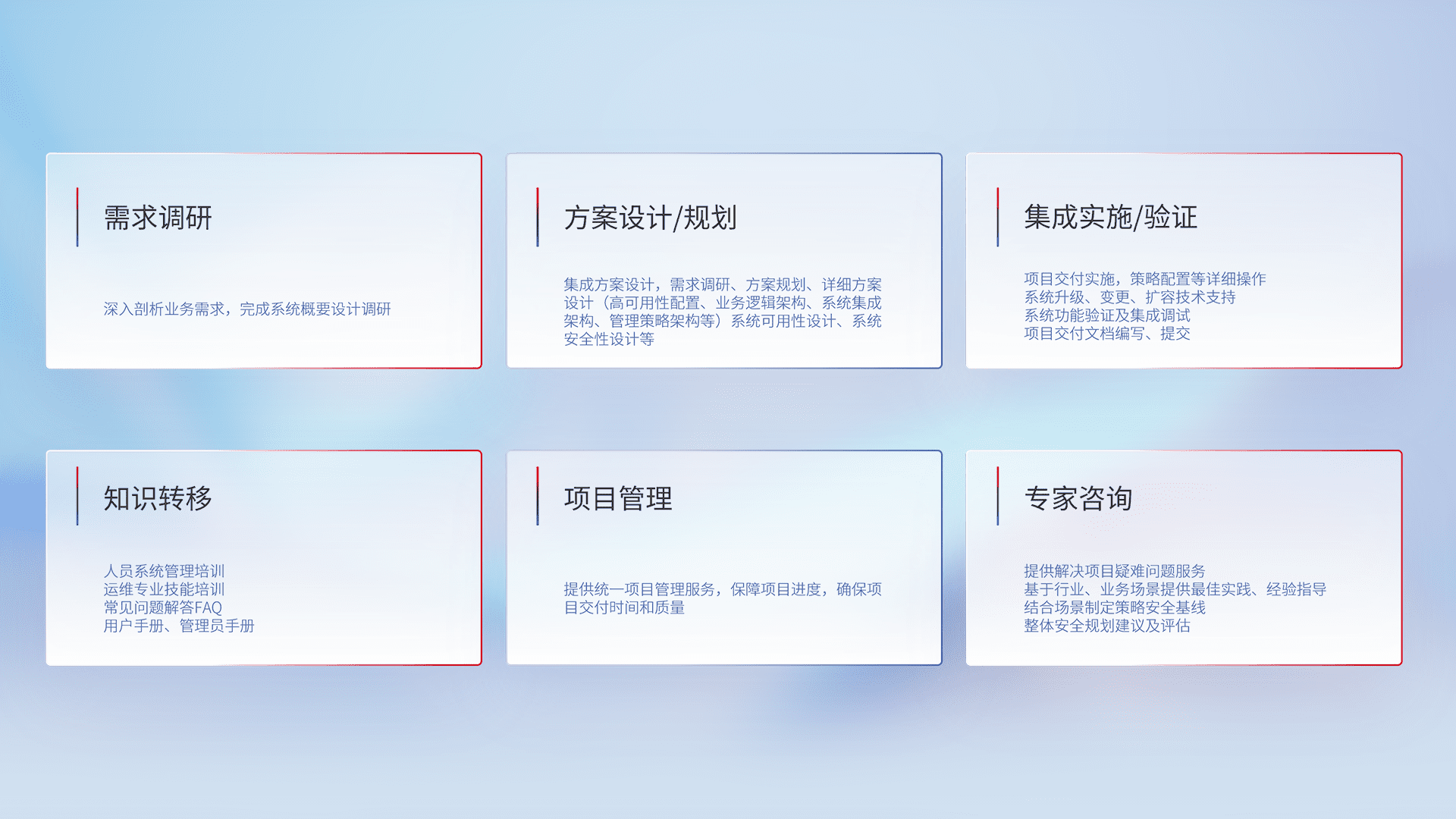 针对客户行业特性,,,将宏观的安全战略和需求,,,通过专业的交付服务,,,,实现项目落地,,,,为客户提供标准规范的集成交付服务。。